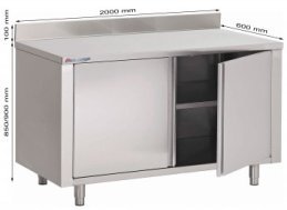 Tables armoires en inox avec une tablette intermédiaire réglable et des portes battantes doublées à poignées profilées sur toute la hauteur. Tablette supérieure est en inox AISI 430 de 0.8 mm d’épaisseur avec les 3 bords tombants de 40 mm et retours de 15 mm et un bord vers le haut de 100 x 20, renforcée par du stratifié blanc de 18 mm . Tablette inférieure est en inox AISI 430 de 0.8 mm d’épaisseur avec bords tombants de 40 mm et retours de 15 mm, renforcée par oméga en inox. Pieds ronds réglables en inox sur la tablette inférieure.
