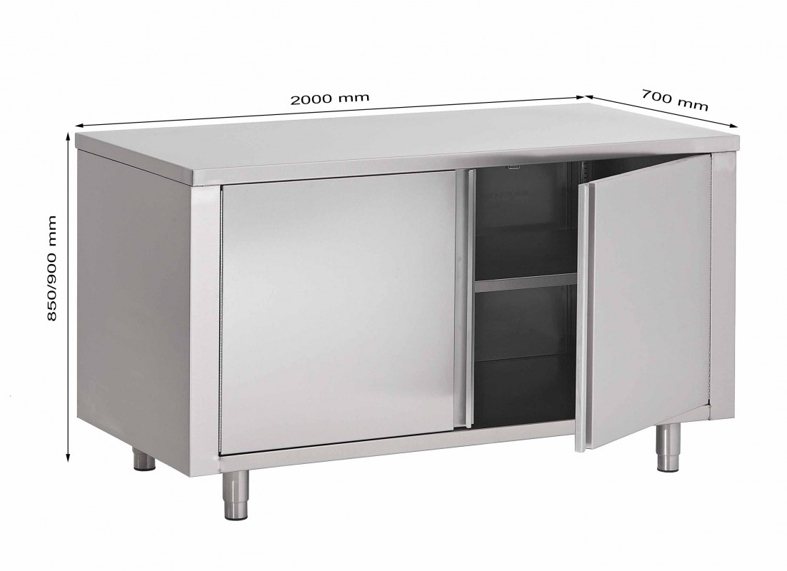 Tables armoires en inox avec une tablette intermédiaire réglable et des portes battantes doublées à poignées profilées sur toute la hauteur. Tablette supérieure est en inox AISI 430 de 0.8 mm d’épaisseur avec les 4 bords tombants de 40 mm et retours de 15 mm, renforcée par du stratifié blanc de 18 mm. Tablette inférieure est en inox AISI 430 de 0.8 mm d’épaisseur avec bords tombants de 40 mm et retours de 15 mm, renforcée par oméga en inox. Pieds ronds réglables en inox sur la tablette inférieure.