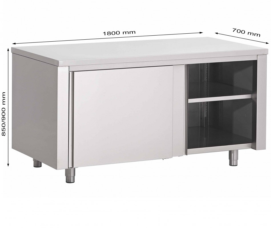 Tables armoires en inox avec une tablette intermédiaire réglable et des portes coulissantes doublées à poignées profilées sur toute la hauteur. Tablette supérieure est en inox AISI 430 de 0.8 mm d’épaisseur avec les 4 bords tombants de 40 mm et retours de 15 mm, renforcée par du stratifié blanc de 18 mm. Tablette inférieure est en inox AISI 430 de 0.8 mm d’épaisseur avec bords tombants de 40 mm et retours de 15 mm, renforcée par oméga en inox. Pieds ronds réglables en inox sur la tablette inférieure.