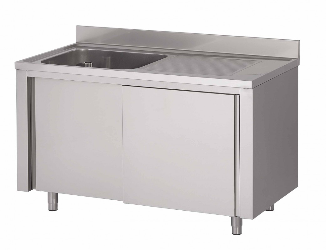 Plonges standards en inox AISI 304 de 1 mm d’épaisseur avec un ou deux bacs et un ou deux égouttoirs selon le modèle. Montées sur une armoire à portes battantes ou coulissantes (à préciser lors de la commande). Les plonges sont fournies avec bondes et crépines mais sans trou pour robinet.