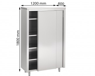 Hoge kasten in R.V.S. AISI 430 Iin 0.8 mm dikte met 2 regelbare en 1 vasteen tussenleggers en dubbelwandige schuifdeuren met geprofileerd handvat over de volledige hoogte. Bovenblad in R.V.S. randboord 40 mm en oversteek van 15 mm, versterkt met drie omégas. Ondertablet ook in R.V.S., randboord van 40 mm, terugplooi van 15 mm en versterkt door drie R.V.S. omegas. Ronde verstelbare R.V.S. poten op het ondertablet gelast