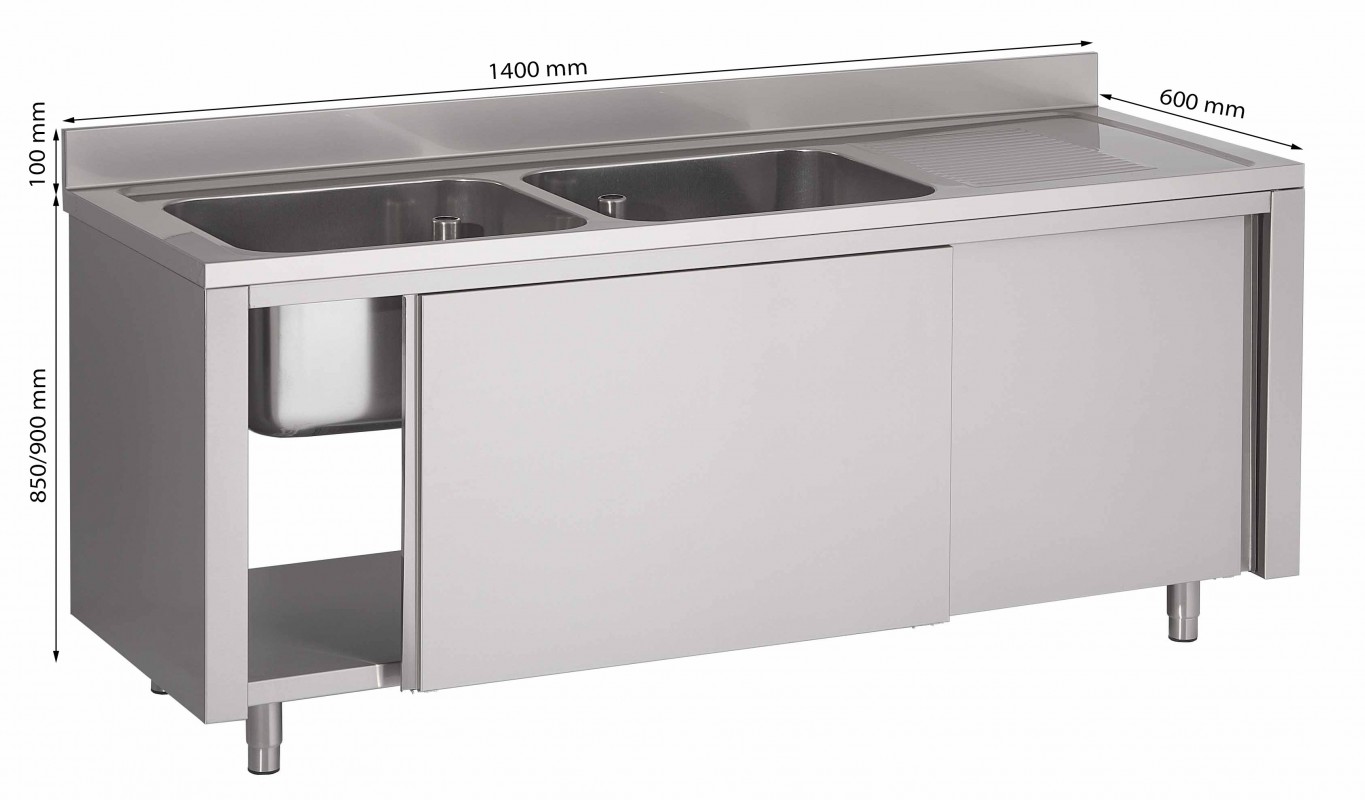 Standaard spoeltafels in R.V.S. AISI 304 met 1 of 2 bakken en 1 of 2 verlekken volgens model. Op kast met draaideuren of schuifdeuren (te bevestigen bij bestelling) in R.V.S. AISI 430 0.8 mm dikte Standpijp en afloopventiel inbegrepen