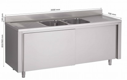 Standaard spoeltafels in R.V.S. AISI 304 met 1 of 2 bakken en 1 of 2 verlekken volgens model. Op kast met draaideuren of schuifdeuren (te bevestigen bij bestelling) in R.V.S. AISI 430 0.8 mm dikte Standpijp en afloopventiel inbegrepen